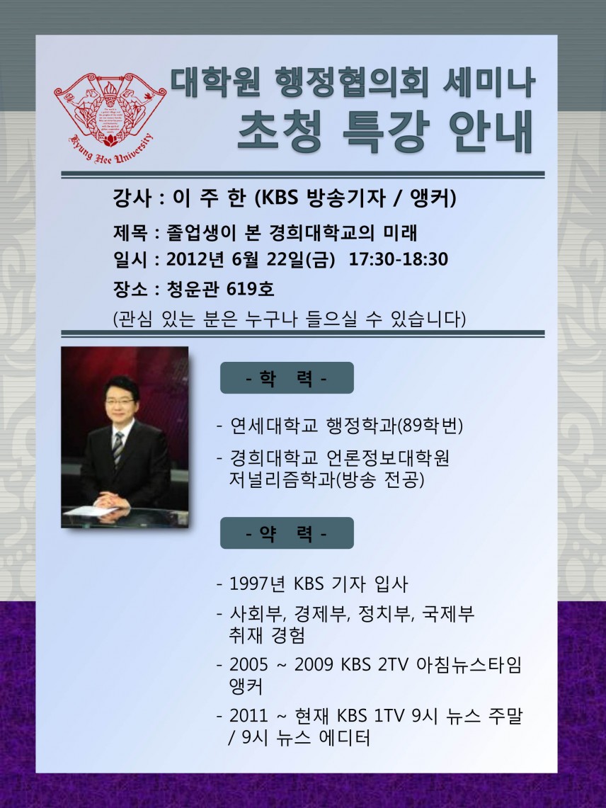 [특강] 본 대학원 졸업생 이주한 KBS 방송기자 / 앵커 초청 특강 안내 등록일 12-06-13 14:05 작성자 행정실 조회수 10,924 * 문의안내 : 02 - 961 - 0560~1 이전글[전문과정]2012학년도 후기 스피치·토론 전문과정 추가 모집 안내 다음글 2012학년도 1학기 종강파티 안내 목록