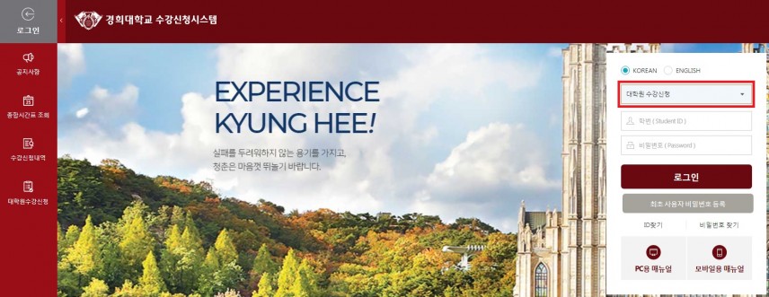 * 학부 수강신청 → 대학원 수강신청으로 변경한 후 로그인