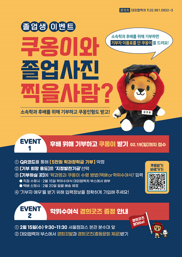 ○ 행사 일시/장소 : 2023.2.15(수) 9:30~11:30 서울캠퍼스 본관 분수대 앞 대외협력처 부스(포토존 옆)